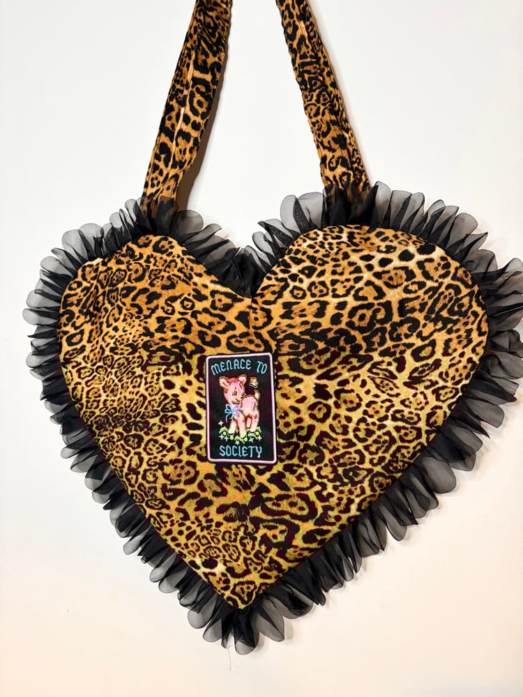 Heart-Shaped Leopard Print Bag – “Menace to Society” Patch with Black Ruffle Edge