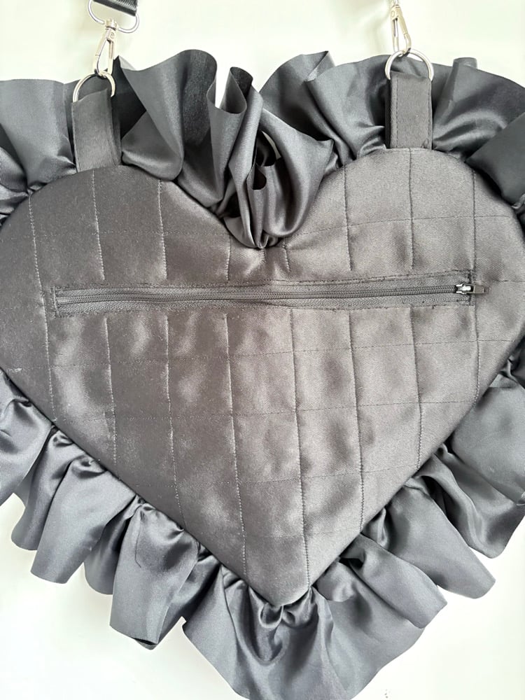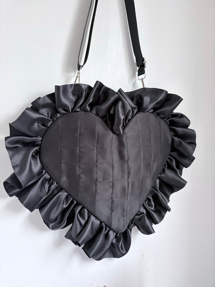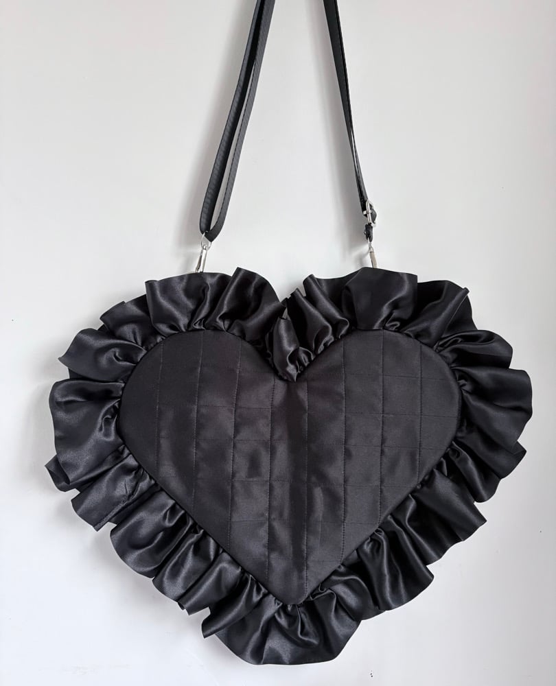 This black satin heart crossbody bag is part of a small sample batch, featuring a soft quilted finish and signature ruffle trim.